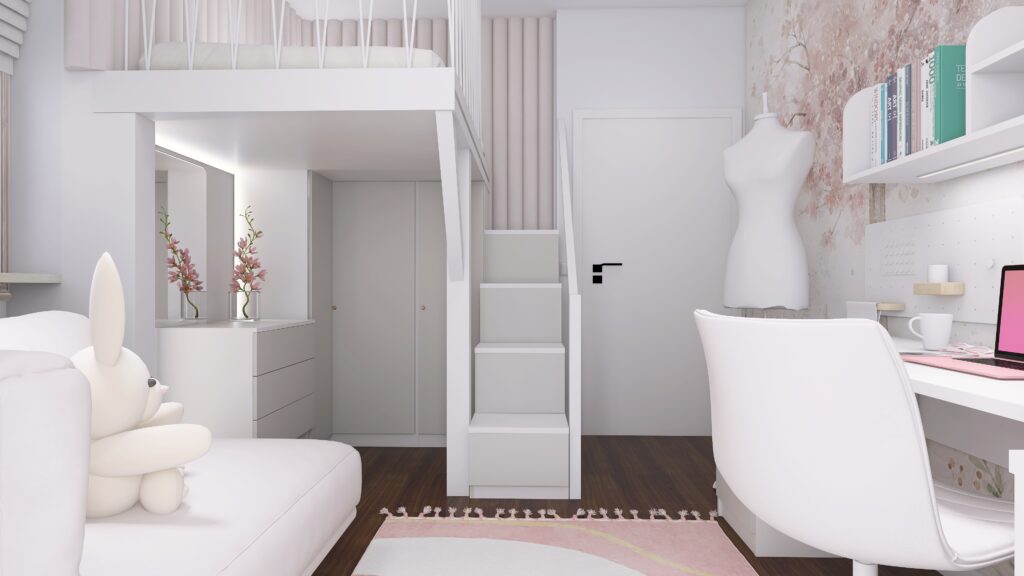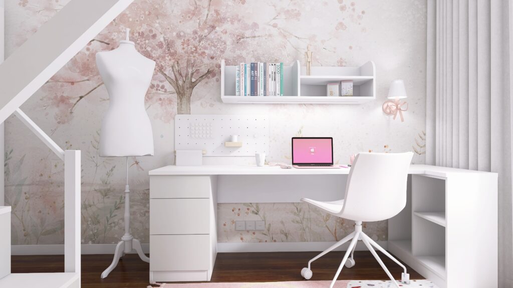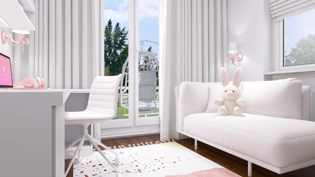 Wnętrze to harmonijne połączenie funkcjonalności, modnych akcentów i przestrzeni do wyrażania siebie. Tutaj młoda projektantka może tworzyć, marzyć i cieszyć się swoim własnym, unikalnym wnętrzem. ![]()