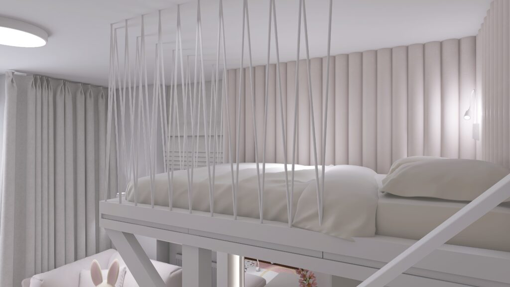 To rozwiązanie maksymalizuje przestrzeń pod łóżkiem, tworząc miejsce na inne funkcje, takie jak szafa narożna, zapewniająca dużo miejsca na przechowywanie ubrań i komoda z szufladami. Lustro na ścianie podświetlone listwą led, optycznie powiększa przestrzeń oraz dodaje lekkości i klimatu.